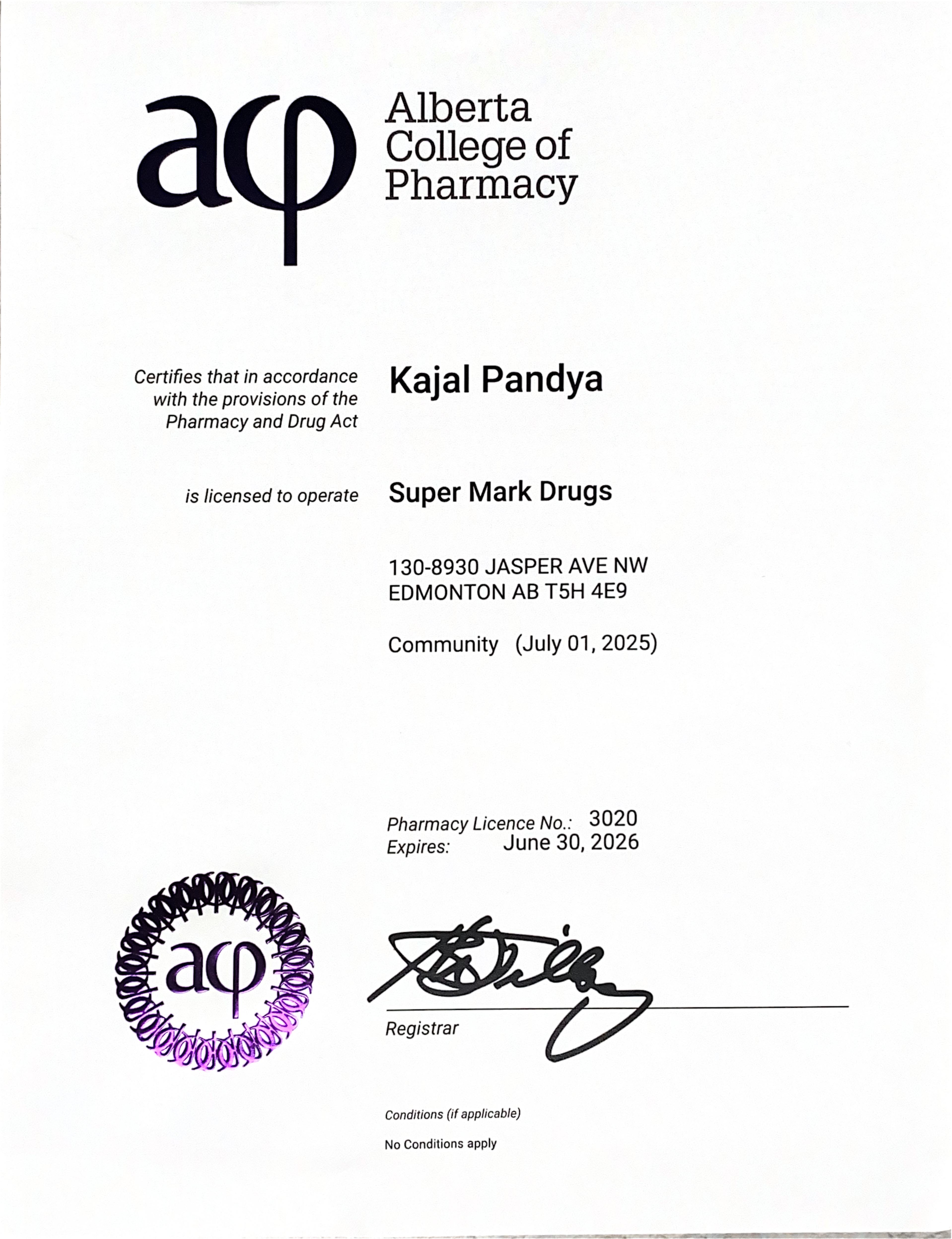The Alberta College of Pharmacists require that all pharmacies publish their license to practise on their website. Please find our information here.